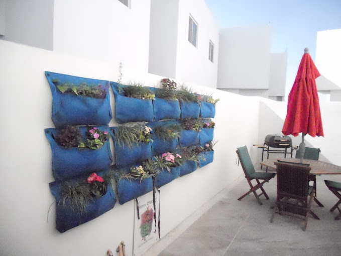 Con unas bolsas que se pueden hacer en casa, con plastico en el fondo para que no humedezca el piso con eso funciona perfectamente para poner un jardin verticales en cualquier area de la casa.